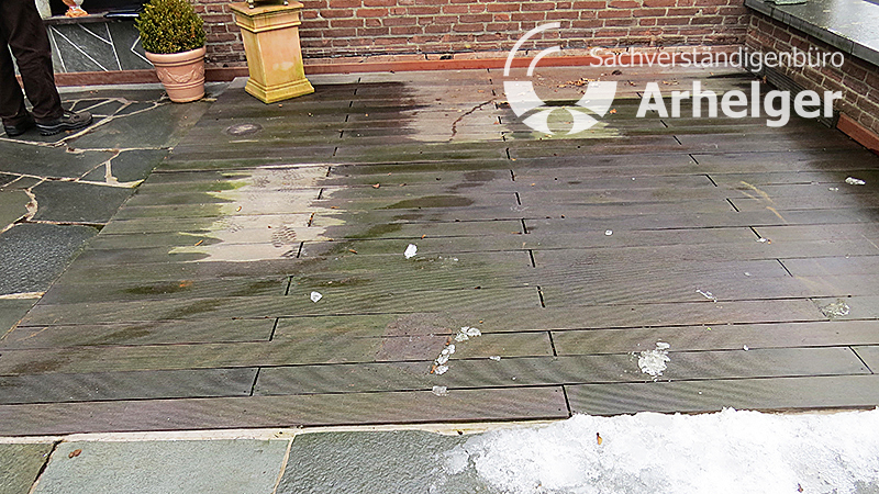 Gutachtenthema: Verschmutzung an Terassenbelag aus Dielen in Bangkirai